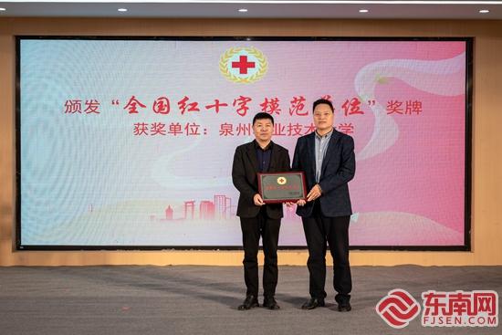 向泉州职业技术大学颁发“全国红十字模范单位”荣誉牌匾。主办方 供图 近日,中国红十字会总会公布全国红十字模范单位表彰对象,泉州职业技术大学成功入选,成为福建省11个获此殊荣的单位之一。活动现场,福建省红十字会相关负责人还向泉州职业技术大学颁发荣誉牌匾。 |