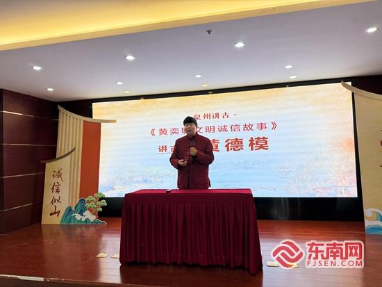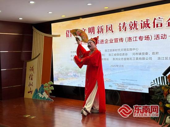 高甲戏表演。东南网记者 吴雅艺 摄 活动现场,企业代表宣读《洛江区文明诚信企业倡议书》,号召广大企业自觉践行诚信经营理念,担当社会责任。随后,一系列富有泉州地方特色、紧扣诚信主题的文艺节目与宣讲精彩上演——泉州高甲戏传承人王培焕带来的《痟公子讲诚信》,以传统戏曲形式生动演绎诚信故事;宣讲员杨熠以《诚信之光照亮文明洛江》为题,深刻阐释了诚信建设的时代价值与现实意义;洛江区实验小学学生为现场观众带来了精彩的木偶剧表演,通过蔡襄建洛阳桥的历史故事传递坚守承诺的宝贵品质;福建省省级非遗传承人黄德模以亲切的乡音讲述了本土企业家黄奕聪的诚信佳话;最后,《文明之花》舞蹈表演为活动画上了优美句点。