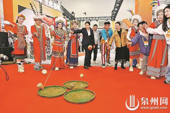 漳州展区,游客参加高山族传统陀螺游戏。 文化“活”起来 沉浸式场景让文化可感可触 步入展馆,文化不再是遥远符号,在“闽台非遗美食”展区,香气四溢的美食长廊串联起海峡两岸超百种味道,在这里,饮食成了增进闽台情感联结的纽带;“茶瓷香文化”展区里,市民、游客可亲身参与瓷器手绘、茶艺冲泡、香道制作,直观感受福建传统工艺魅力;“世遗海丝游”主题展区内,通过场景还原、图文解说等形式,串联泉州开元寺、安平桥等世遗景点,搭配南音、提线木偶、蟳埔女簪花围等非遗项目持续展演,让千年海丝文化可看、可玩、可体验。 这种“活”起来的体验,在各地特色展馆尤为明显。在“海丝源头 成功故里”南安馆,参观者不仅能欣赏威武的成功马铠、美味诱人的成功家宴,还能通过一台“拍照冰箱贴打卡机”,将自己的形象AI动漫化,一键融入南安山水画卷,生成独特的数字文创纪念品,把“海丝记忆”生动带回家。