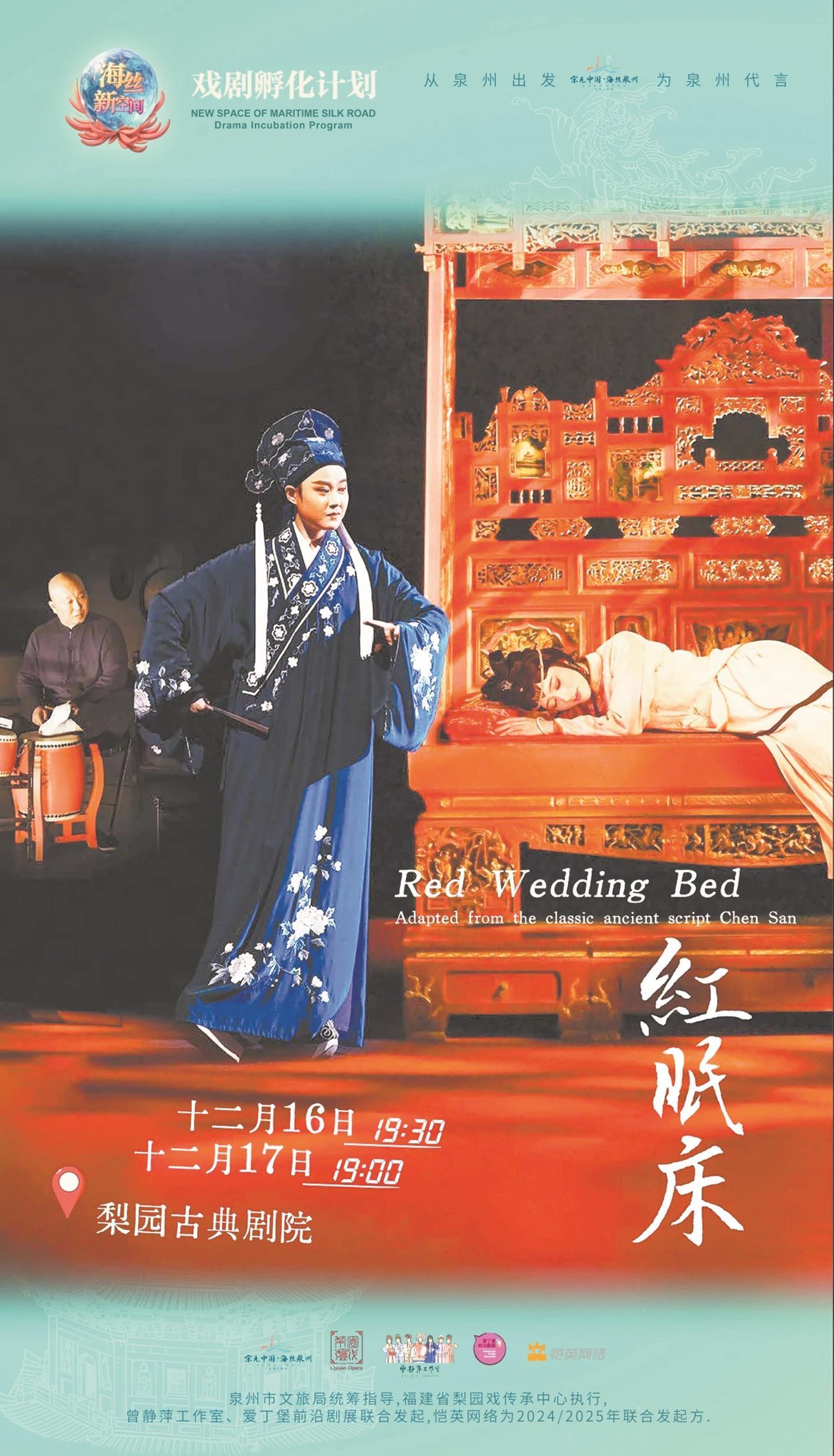 梨园戏《红眠床》海报 演出安排 17日14:00—15:30,泉州威远楼,高甲戏《罗刹记》; 17日—19日每日16:30—17:30,伯勒小镇三楼露台,花朝戏《这是我们降落的地方》; 17日19:00—20:30,泉州梨园古典剧院 梨园戏《红眠床》; 17日21:00—22:00、18日—19日每日20:30—21:30,伯勒七星村,木偶剧《周记》; 18日—19日每日20:00—21:00,丰泽蟳埔·橘若,泉州木偶戏《机灵偶遇》。 |
