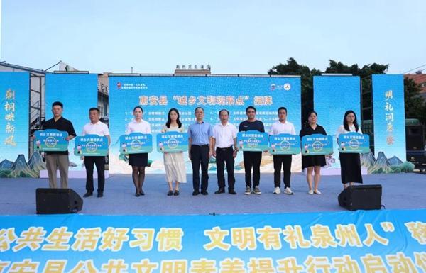 惠安县举办“刺桐映新风 明礼润惠安”移风易俗主题活动,主办方为“城乡文明观察点”授牌。 文明实践多样化提升城市文明。石狮市开展“新风拂渡口·家声润狮城”——“百村千讲家常话”社会大宣讲,以“志愿宣讲+爱心义卖+节目展演+健康服务”等形式融合家风传承与文明传播。德化县举办“文明有象 瓷都新风”专场文艺演出,将德化山歌、木偶戏、南音等非遗项目与公共文明素养提升“八大有礼行动”结合,打造八个具象化文明场景,开展“文明观影 有礼有你”活动,邀请道德模范、身边好人等担任“文明观影宣传员”,通过榜样示范引导群众践行文明。