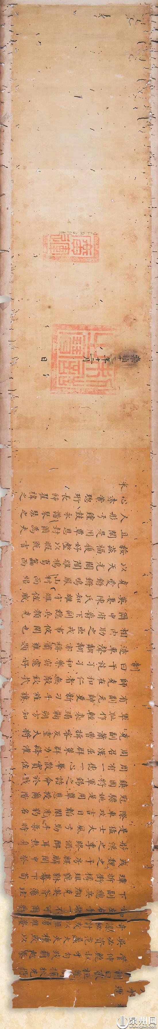 近日,一件经中国闽台缘博物馆5年专业修复的明代诰命圣旨复刻件,被迎回晋江市安海镇西安村颜克英大夫第安奉。这份承载抗夷名将颜克英功绩的历史信物,既延续了家族与地域的文化传承,也见证了泉州文物专业保护的成效。