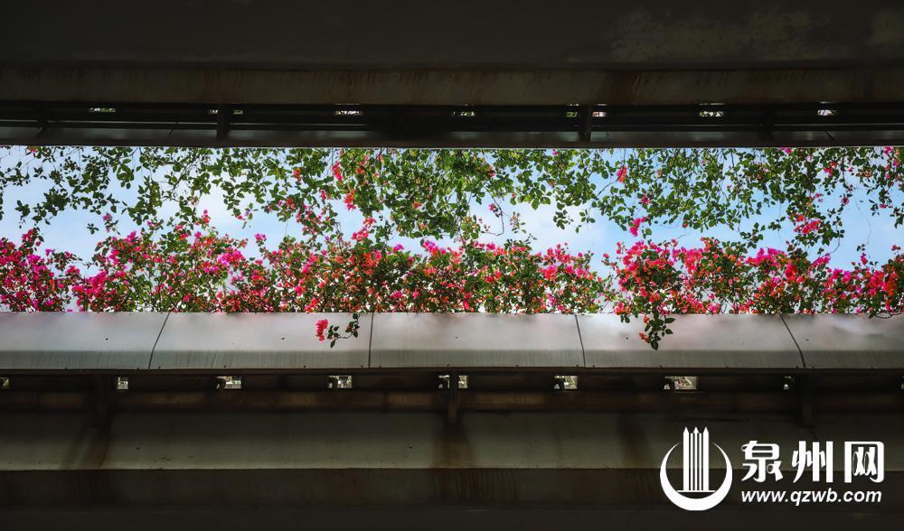 在车水马龙的后渚大桥旁,一座立交桥上的三角梅正肆意绽放,将天空染成了一片绚烂的花海。