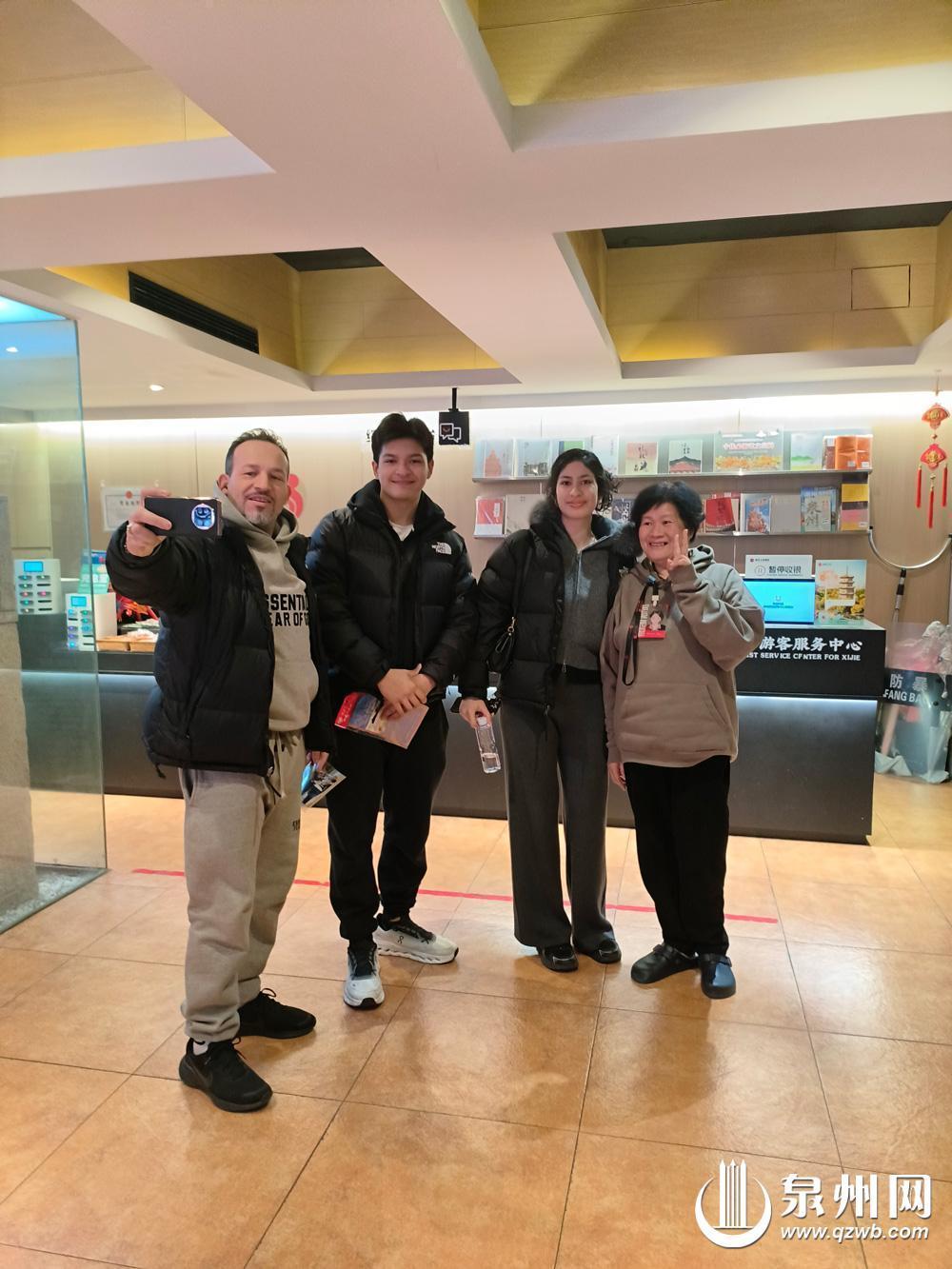 在西街游客服务中心,外籍游客与吴淑华热情合影。 服务很贴心 近50个“一键通”旅友小屋覆盖古城 “我们在游客咨询处遇到了一位非常友善的女士,她和蔼可亲,很高兴认识她!”在泉州文旅集团西街游客服务中心,工作人员吴淑华向记者展示了一位外籍游客到泉州游玩后发布的微信朋友圈。吴淑华说:“近年来,来泉州玩的外国人越来越多,我们泉州真的在世界上出名了。” “我不懂英语,但是看到有外国人进来,我就会热情地跟他们说‘Hello!Hi!’”吴淑华说,在服务外籍游客时,她更多是用肢体语言表达对他们的欢迎,并热情提供中英文双语的旅游宣传册,引导他们用手机扫描“泉州古城‘一键通’旅友小屋”展示牌上的二维码体验便利服务。 设置在西街游客服务中心的“一键通”旅友小屋位于大门右手边,上面放置“一键即推导游讲解”“一键即办旅游投诉”“一键即知古城资讯”“一键即获便利服务”4个牌子,全部为中英文双语,上面还标注着“入境游客服务点”。 记者了解到,这样的旅友小屋在泉州古城范围内有近50个,“一键即获便利服务”功能可为入境游客提供实时翻译,并设立货币兑换指引、预约公交(“小白”)等涉外服务绿色通道,为境外来宾提供外卡刷卡、外币及零钞兑换、呼叫“小白”等一站式服务,通过“大额刷卡、小额扫码、现金兜底”,全面保障入境游客的支付便利。