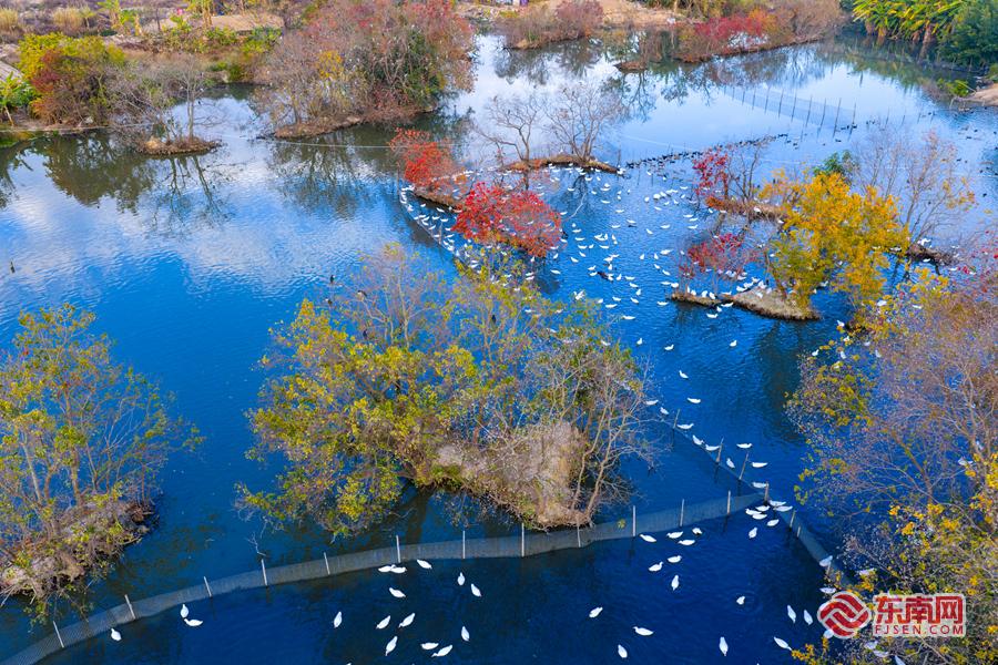层林浸染与湖水相映成趣,成群白鸭或栖息或游弋,尽显自然生机。邓文祥 摄 东南网1月18日讯(本网记者 林杰 通讯员 邓文祥 摄影报道)冬日暖阳,惠风和畅。近日,在泉州市惠安县紫山镇光山村的一处静谧湿地,澄澈的水面如同一面镜子,倒映着岸边红、黄、绿交织的树木。虽然时值深冬,但这里却生机勃勃:数十只白鹭或优雅地掠过水面,或在浅滩上踱步觅食,与湖面上游弋的白鸭家禽相映成趣,共同勾勒出一幅人与自然和谐共生的冬日田园诗画。