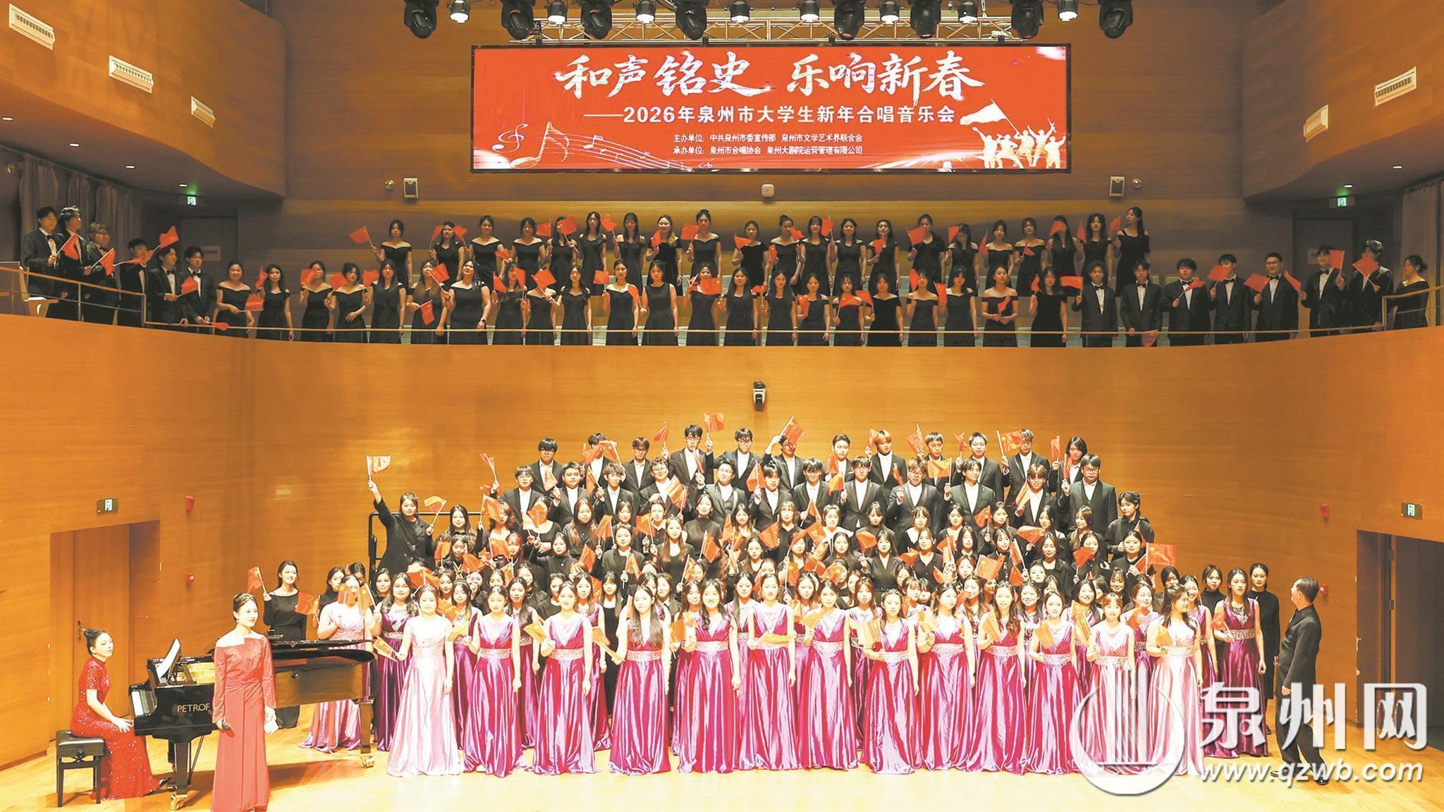 日前,“和声铭史 乐响新春”2026年泉州市大学生新年合唱音乐会在泉州大剧院举行,以青春之声叩响新年大门,用和声之美铭刻时代旋律。 本次音乐会由市委宣传部、市文联主办,泉州市合唱协会、泉州大剧院运营管理有限公司承办。音乐会汇聚了我市七所高校的优秀大学生合唱团,近500名学子以饱满的热情和精湛的技艺,为观众奉献了一场高水准、充满青春气息的艺术盛宴。 整场音乐会由两首承载着历史记忆与奋斗精神的经典之作《南泥湾》和《映山红》拉开序幕。演出精彩不断,从闽南理工学院教育学院“ZHU造”美育合唱团带来的经典红歌《南泥湾》《映山红》,到泉州师范学院女声合唱团演绎的婉约诗词《山中月》《青玉案·元夕》;从仰恩大学艺术与教育学院合唱团对《敕勒歌》的苍茫吟唱与《五月的鲜花》的深情礼赞,到泉州经贸职业技术学院合唱团带来的古韵《秋风辞》与民族风情《高山青》;从黎明职业大学学生合唱团激昂澎湃的《我爱你中国》《游击队歌》,到泉州华光职业学院合唱团深情咏叹的《长城谣》和饱含乡情的《洛阳桥》;最后泉州师范学院2023级音乐学混声合唱团以雄浑气势唱响《大江东去》与《保卫黄河》,将音乐会推向高潮。 “一首首耳熟能详的经典曲目,一段段感人至深的时代旋律,在年轻歌者们层次丰富、和谐统一的声部演绎下,被赋予了新的生命力。”主办方相关负责人表示,歌声中有对历史的追忆、对祖国的热爱、对家乡的眷恋,也有对青春的歌颂和对未来的憧憬,深深打动了在场的每一位观众。 “一条大河波浪宽,风吹稻花香两岸……”熟悉的旋律响彻音乐厅,音乐会的尾声,在观众持久不息的掌声中,所有参演合唱团成员共同登场,与现场观众一起,以一首深情磅礴的《我的祖国》将气氛推向高潮。(泉州晚报融媒体记者陈智勇 通讯员苏温捷) |