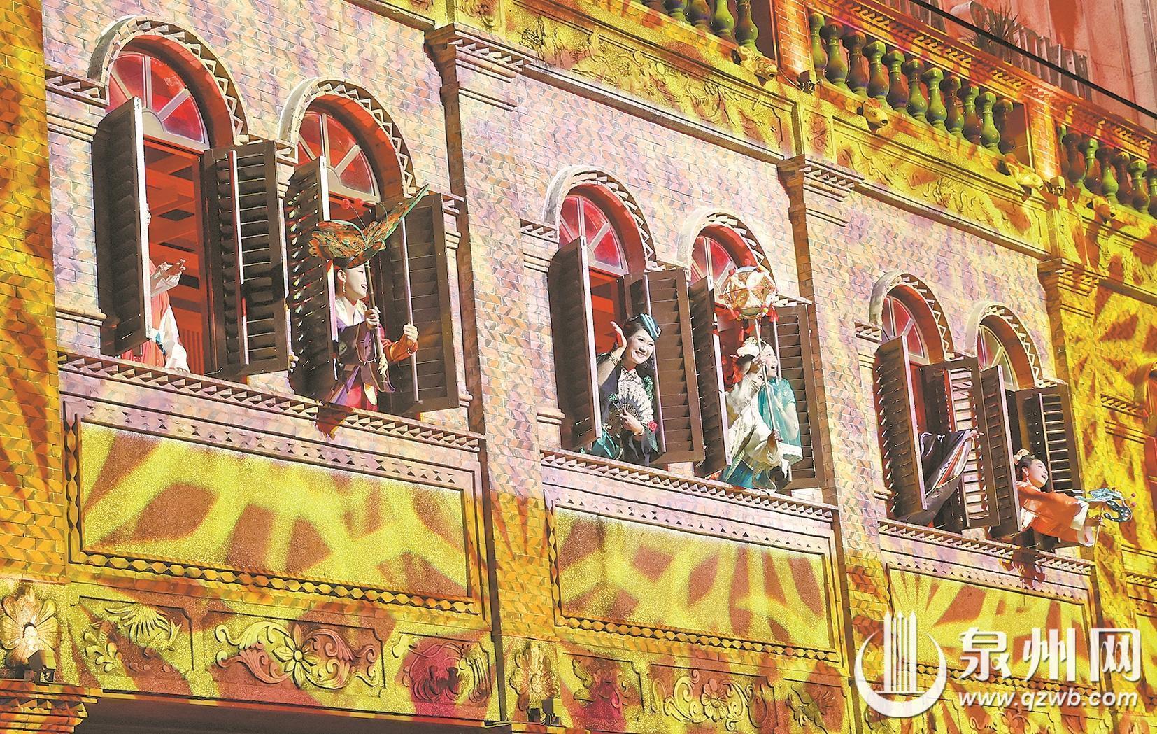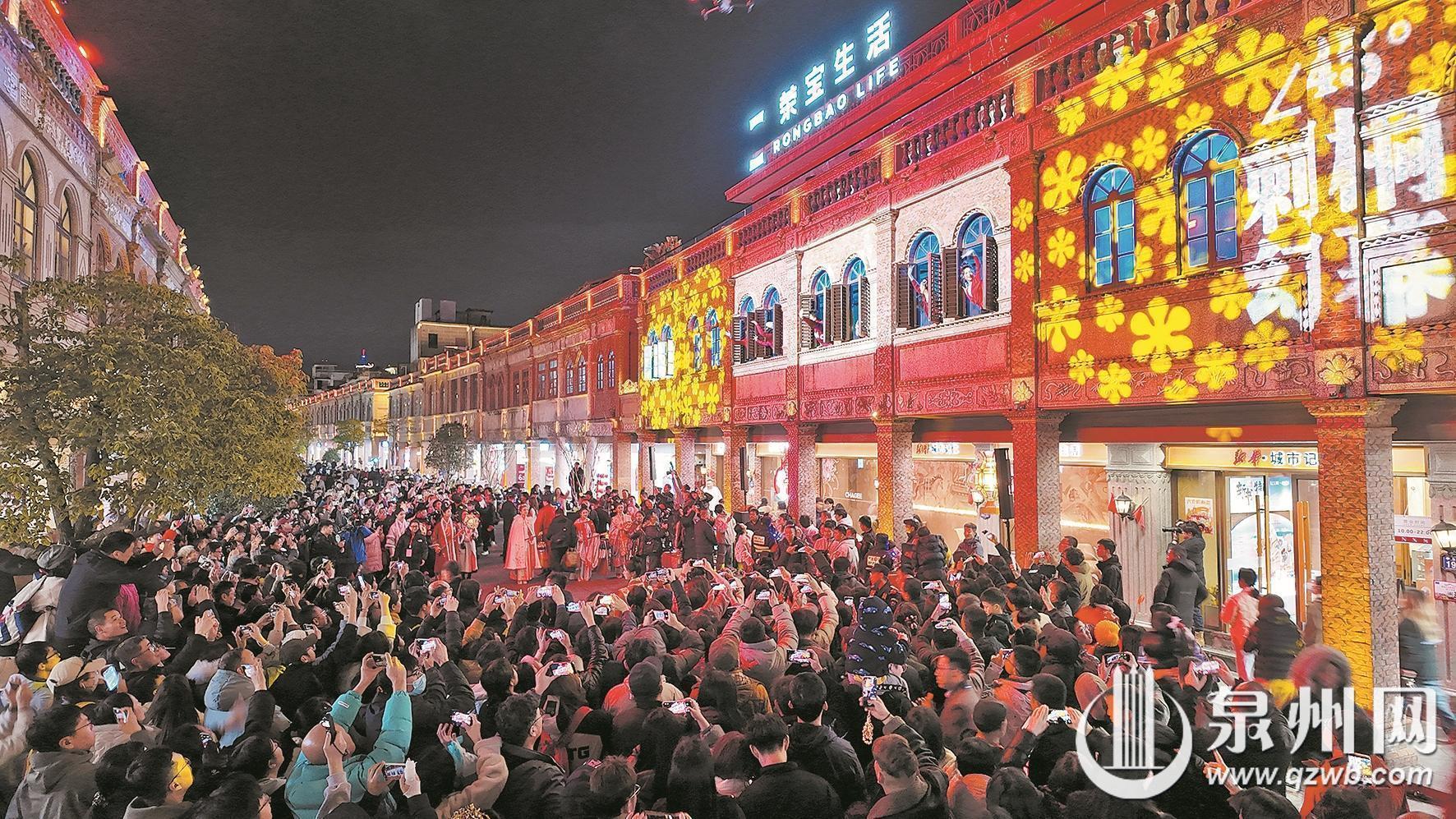 亮灯仪式后,中山中路上演了沉浸式演出《刺桐宋潮·海丝迎春》,以“幻幕”光影技术打造古今对话的视觉盛宴。这场“刺桐幻幕”演出,以宋元刺桐港“世界海洋商贸中心”的繁荣盛景为基底,将南音、拍胸舞、火鼎公婆、掌中木偶、提线木偶等闽南非遗项目融入剧情,在《爱拼才会赢》等经典闽南语歌曲的伴奏下,再现“市井十洲人”的多元共生场景。整场演出聚焦闽南传统迎春习俗,通过科技赋能让非遗“活”起来,当演员们用亲切的闽南语高呼“来泉州过年咯!”时,现场气氛达到高潮。
