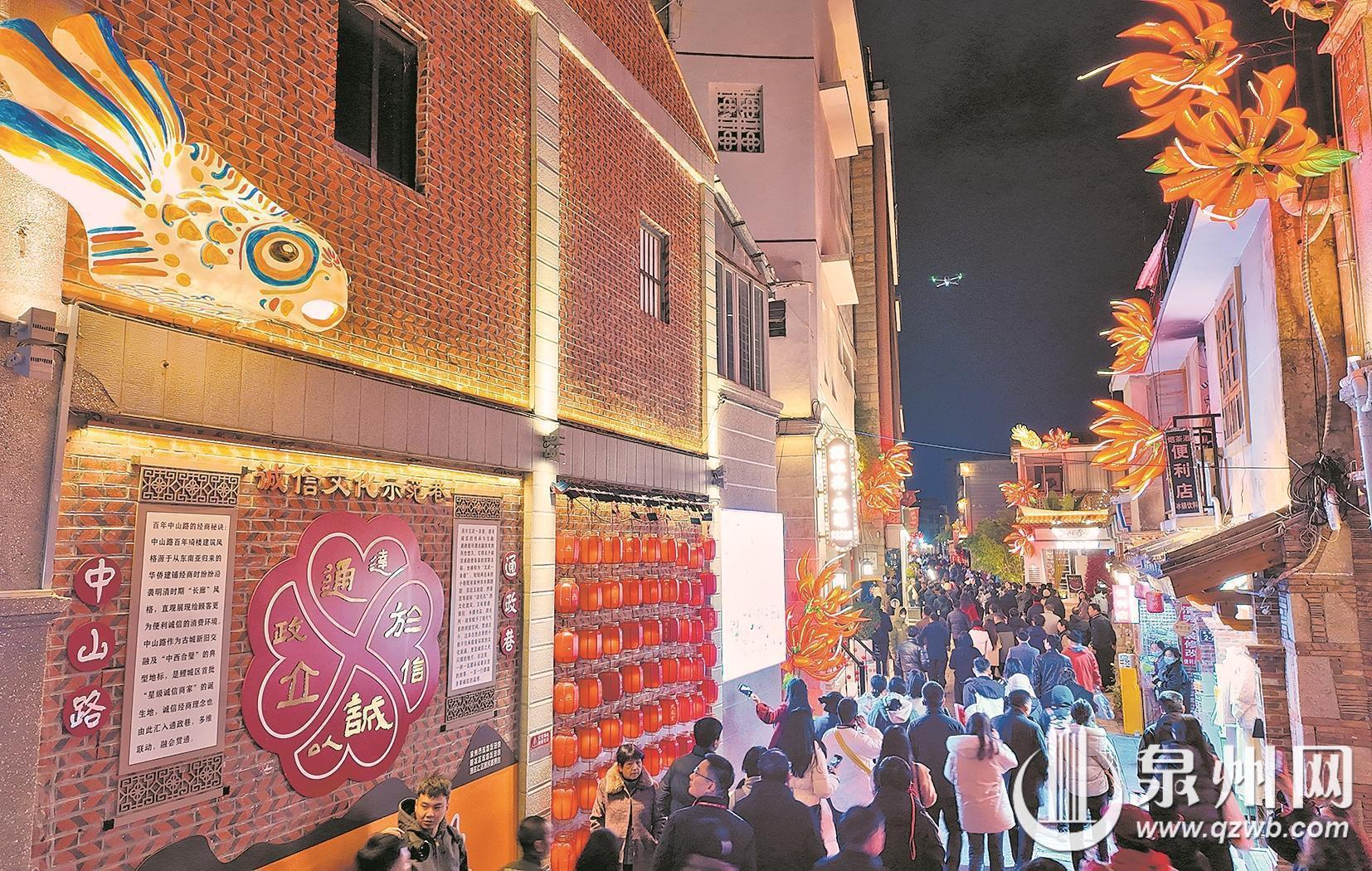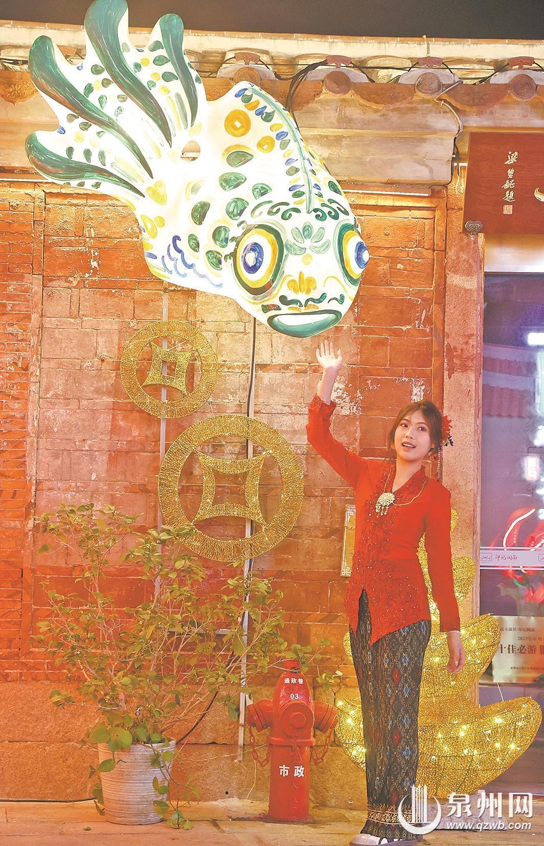 与此同时,泉州通政巷的刺桐花灯同步正式亮灯,为古城增添一抹火红亮色。作为泉州市的市花,刺桐花红似火,象征着闽南人对未来的美好希冀,如今这些象征希望的“花朵”沿着通政巷的巷口、屋顶、檐角次第“绽放”,一路繁花簇拥,将古巷装扮得格外喜庆。值得一提的是,今年通政巷的花灯特别融入闽南传统建筑构件“滴水兽”元素,憨态可掬的造型搭配“刺桐滴水兽,好运攒个够”的吉祥寓意,成为古巷中的人气打卡点。(东南早报融媒体记者 张素萍 王柏峰 通讯员 曾世彬 文/图)