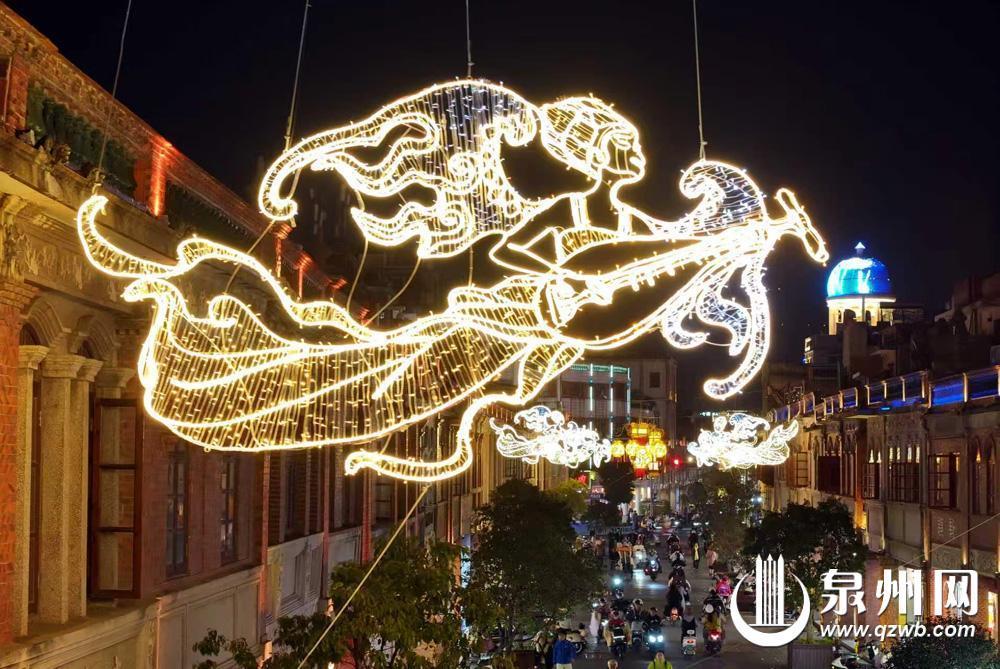 28日8时许,“千灯映古城”活动在泉州古城正式拉开帷幕。当晚,三排悬挂于中山中路两侧骑楼间的巨型挂式花灯和“妙音飞天”装置次第亮起,两旁的“妙音飞天”手持乐器,身姿曼妙,衣袂翩跹,姿态灵动;垂挂于中央的巨型非遗花灯则散发着细腻柔和的灯光,为夜空增添了一份独特的雅致。