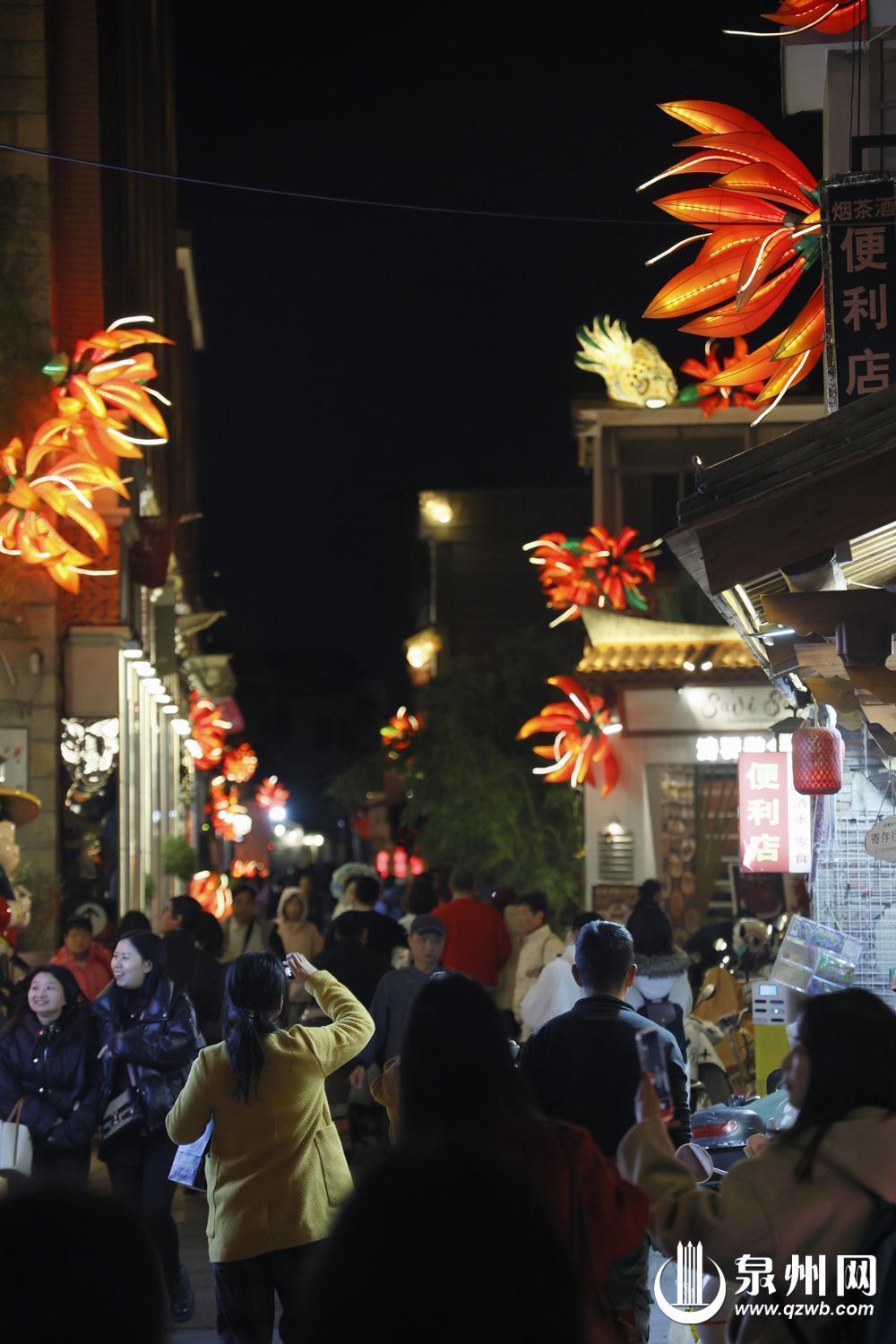 当晚9点多,藏身于通政巷的“刺桐花灯”也柔和亮起。与主干道的灯光艺术不同,这里的光影更显幽静与诗意。以泉州市花“刺桐”为灵感的火红光影,如点点星火般点缀在巷口、屋顶与檐角之间,为静谧的小巷添上一抹温暖的新春色彩。