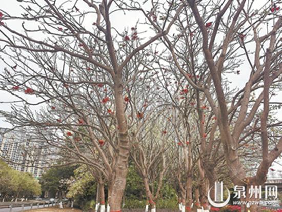 晋江池店高速出入口互通区绿地,火红的刺桐花花朵“点燃”枝头。(金植 摄) |