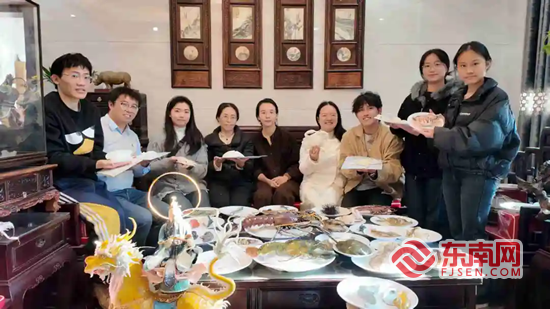 图为实践队与传承人李细萍合照。 活动中,实践队与来自台湾的青年设计师进行座谈,共同探讨年俗文化的创新表达与文创开发。台胞林先生表示:“妈祖是两岸共同的文化记忆,也是增进彼此了解与亲情的重要纽带。”双方围绕文化创意、年轻化传播等话题展开交流,体现了春节文化与妈祖信仰在促进两岸青年沟通中的积极作用。
