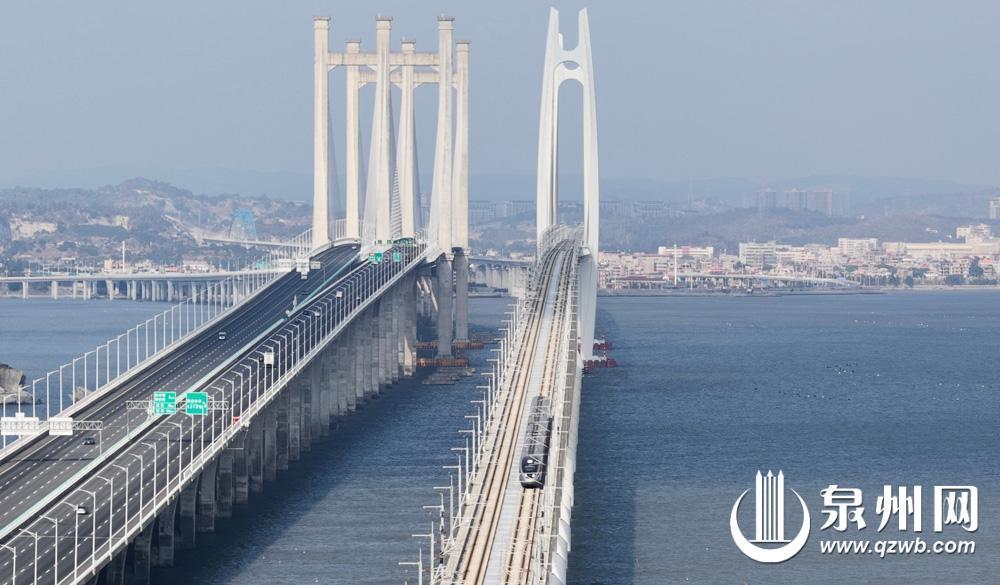 在泉州湾跨海大桥,高铁列车和汽车并行,网友感叹“好可爱的春运图景”。
