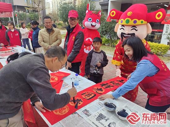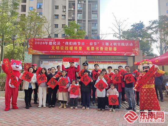 活动现场。主办方 供图 东南网2月10日讯(本网记者 林婕 通讯员 林耀坤)腊月年味浓,文明实践暖。近日,德化县“我们的节日·春节”——“文明实践暖邻里 笔墨书香迎新春”主题文明实践活动举办。活动巧妙融合传统年俗与平安建设,通过写春联、赠祝福、话安全等形式,为社区居民送上了一份既有温度又有深度的“新春礼包”。 现场张灯结彩,笑语盈盈。活泼的“财神”人偶穿梭互动,送上新春彩头;“文明实践暖邻里 笔墨书香迎新春”的横幅下,数位书法爱好者展纸挥毫。楷书庄重、行书飘逸,一个个墨香馥郁的“福”字、一副副寓意吉祥的春联在笔尖绽放。志愿者们细心铺纸、晾晒,地面很快铺开一片红彤彤的“春意”。 “阿姨,送您一个‘福’,过年高兴更要平安,喝酒可千万别开车!”“大爷,春联收好,也收好这份防诈骗提示,守好钱袋子过年更安心!”——活动的亮点在于,祝福与叮咛在这里自然交融。民警与志愿者在送上手写“福”字与春联的同时,结合节日特点,开展面对面的交通安全、防范诈骗、防火防盗等温馨提醒,让文明理念与安全意识在亲切互动中浸润人心。 活动尾声,一张充满温情的大合影记录了美好瞬间。身着红马甲的志愿者、挥毫泼墨的书法家、社区工作者与居民们齐聚一堂,共同举起手中的“福”字。身后横幅与张张笑脸相映,勾勒出文明邻里的和谐图景。 “这活动办到我们心坎里了!”社区居民拿着墨迹未干的春联称赞道,“既有手写的年味,又学到了实在的安全知识,心里更踏实、更暖和。