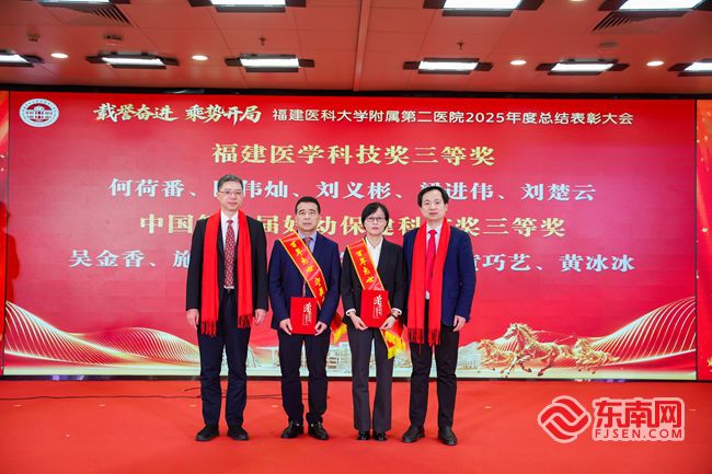 表彰国家自然科学基金获得者。福医二院 供图 东南网2月10日讯(本网记者 谢玉妹 通讯员 曾婧琦 实习生 黄钰瑄)10日晚,“载誉奋进,乘势开局”福建医科大学附属第二医院2025年度总结表彰大会在东海院区举行。 2025年,福医二院在医疗、教学、科研、学科建设等领域成果丰硕:在国家三级公立医院绩效监测中排名全国前10%,获A+等级;再获第七届“全国文明单位”称号;新增1个国家临床重点专科,第三代试管婴儿技术获国家批准,首台腔镜手术机器人开机投入使用;科研教学成效显著,获国家自然科学基金立项8项,创医院历史新高。 会上,福医二院党委副书记、院长胡建民宣读表彰决定,对2025年度医院先进集体和优秀个人予以表彰。表彰覆盖医疗、教学、科研、管理、服务等多个领域,包括安踏科技奖特殊贡献奖、“十佳医师”“十佳教师”“优秀教师”“青年之星”“青春榜样”“十佳护士”、优秀医学(诊疗)中心等多个奖项,同时涵盖省市级科普、病案、教学案例类奖项及国家级、省级荣誉与案例。 福建医科大学党委常委、副校长陈万金在讲话中希望全体师生医护员工以先进为榜样,聚焦高水平省级区域医疗中心建设,真抓实干、奋勇争先。同时寄语福医二院,以此次大会为契机,持续巩固国家三级公立医院绩效考核A+成果,发挥省级区域医疗中心辐射作用,深化医教研协同,开创高质量发展新局面。 福医二院党委书记胡建达表示,2026年是实施“十五五”规划的关键之年,也是福医二院实现更高水平发展的重要一年。他号召全体人员以受表彰先进为榜样,同心同德、砥砺前行,奋力谱写医院高质量发展新篇章,为护佑人民健康、推进健康中国与教育强国建设作出新的更大贡献。