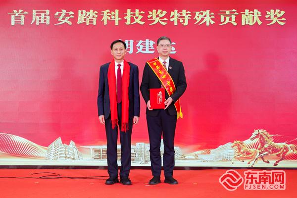 福医二院党委书记胡建达(图右)获得首届安踏科技奖特殊贡献奖。福医二院 供图