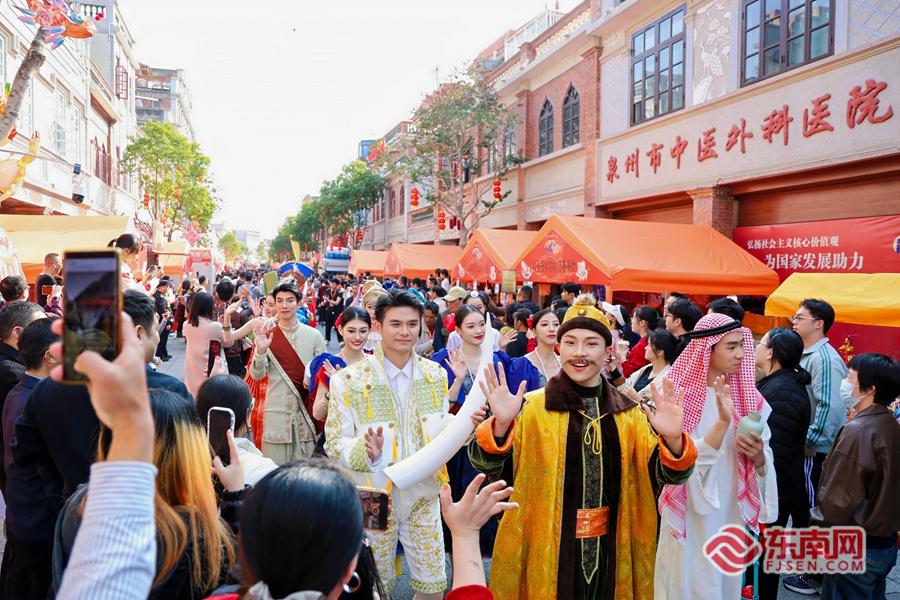 东南网2月19日讯(本网记者 谢玉妹)“泉南都会,蕃舶所凑。万里梯航,岁无虚月。诸国腴物,辐辏刺桐”……2月19日正月初三,一场还原千年前迎番货经典场景的非遗街秀在泉州古城举行,为这座世遗之城的新春增添了浓郁的海丝风情。