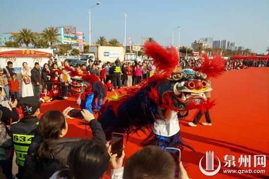 人群中,家住鲤城区的老泉州人黄阿婆正拉着邻居的手感慨:“我小时候过年就是这样,人挤人,热闹得很。你看这些青狮、这些鼓,几十年了还在,真好。”她身旁的小孙子手里攥着刚领到的糖果笑得灿烂。 狮舞闹新春 非遗暖人心 在蟳埔渔人码头,另一场非遗盛宴同样沸腾。作为“骐骥驰刺桐·非遗绽芳华”泉州非遗街秀的主场活动之一 ,“狮舞献瑞”专场汇聚了大开道、青狮、德化纸狮、刣狮等多项狮舞技艺。