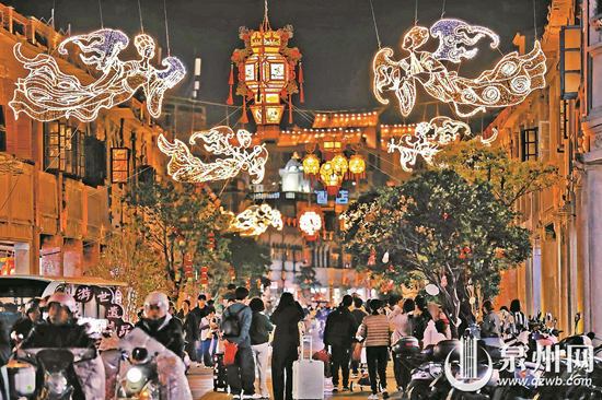 市区中山路夜景 (鲤城文旅局供图) 今年新春佳节,作为泉州热门游览地的泉州古城夜景全面升级。朝天门、南俊路、庄府巷、威远楼等处新增多个主题亮化装置,既展现世遗之城气韵,又融入科技新潮光影,呈现出层次更为丰富的视觉景致,为广大市民和天南海北的游客打造一座流光溢彩的“光明之城”。 朝天门前,一座宽约4米、高约2米的大型“福”字艺术装置惊艳亮相。装置造型融入闽南古厝燕尾脊线条,采用橙红与鎏金配色,并搭配百福纹、海浪祥云纹,展现海丝文化与闽南地域特色。夜幕降临,动态灯光光影流转、色彩变幻,营造出“福气临门”的视觉效果。值得一提的是,装置的宽与高分别对应“迎福”与“纳福”,以呼应朝天门作为宋元时期“迎朝贡、接祥瑞”礼制门户的历史底蕴。 |