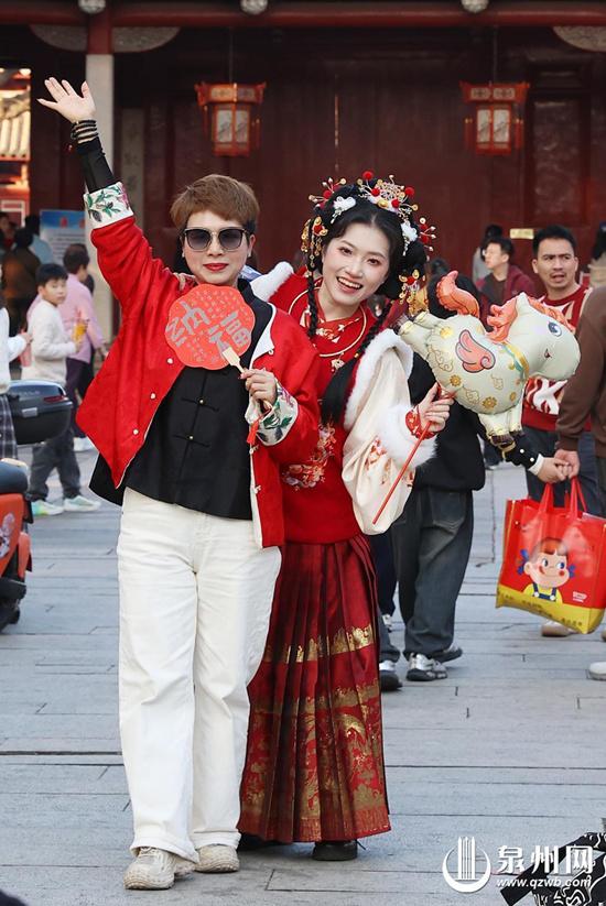 游客在文庙感受春节氛围 国内游客 泉州人气旺,服务很贴心! 在泉州西街游客服务中心,来自苏州的庞先生一家寄存行李后,轻松牵手出游;一位北京游客前来归还轮椅,他的朋友在游玩时不慎扭伤,所幸这里有轮椅可借用。他们都表示,近期去过不少城市,泉州人气格外旺,游客服务中心的“免费服务”特别贴心。 春节假期,泉州推出“六免”惠民措施,市县联动提供免费停车、免费公交、免费接驳、免费奉茶、免费看戏、免费讲解等暖心服务。各地游客纷纷点赞:在泉州,不仅多数景点免费开放,很多配套服务也免费提供。 午后暖阳下,在中山南路一家甜点店外,叶先生与两位分别来自上海和浙江的战友,三家人围坐品尝着石花膏。“昨天去了洛伽寺,风景很美;吃了姜母鸭,果然名不虚传。”他们感慨这个季节来泉州玩很舒适,称赞泉州旅游市场火热,既好玩又好吃。 来自深圳的王女士一家与朋友们跟团来泉州旅游,他们说,泉州和深圳风格迥异,这里文化底蕴深厚、烟火气浓郁,特别适合带孩子游玩。 春节期间,在社交平台上涌现大量“春节泉州游”推荐帖,游客们表示,“泉州真是一个去了还想再去的地方”“正月到泉州玩,民俗活动丰富,年味浓郁,好吃好逛,天气还特别好”。