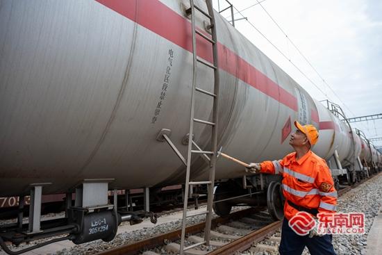 林敬铭在检查列车车体。陈倜 摄
