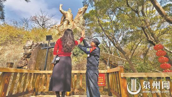 张新华帮游客调整姿势,寻找最佳拍照角度。 春节期间,泉州大坪山郑成功雕像彻底火成“全国许愿顶流”,不少市民、游客慕名前来打卡这座金色骑马塑像,借着马年讨个“马上成功”的好彩头。在网红打卡机位,保安大叔张新华化身专属摄影师,不仅耐心帮游客拍照,还细心指导姿势,成为现场最忙碌也最暖心的人。 前日下午2时许,记者来到大坪山郑成功公园,半山腰的网红打卡点早已排起长队,上百名游客等候与郑成功雕像“击掌”合影。保安大叔张新华正忙个不停,时而蹲坐取景,时而起身指导游客调整姿势:“手再高点,再往后一点……” 一名游客刚拍完,立刻就有人递上手机请他帮忙。游客们连连道谢,还笑着打趣:“大叔必须加工资!”张新华也幽默回应:“加个鸡腿就行!” 张新华介绍,他到郑成功公园从事保安工作已经5年了,往年都没有这么大的人流,今年恰逢马年,再加上网络平台推荐了最佳打卡机位,大坪山郑成功公园迎来客流高峰。起初他只是负责现场维持秩序,可不少游客找不到角度,拍照耗时较长,容易引发排队矛盾。于是他主动上前,帮大家调整姿势、寻找最佳拍摄角度,既提升效率,也减少游客等待时间。 他每天早上6点多就到岗值守,中午饭还没吃完,一听到对讲机里说打卡点又排起长队,立刻放下碗筷上山疏导。“游客一个接一个找我拍,一坐下就几乎起不来了。”张新华笑着说。 来自杭州的吴先生带着家人前来打卡,在张新华的帮助下,顺利拍出与雕像“击掌”的完美合影。“拍得真好,大叔太热心了,特别暖心!”吴先生连连称赞。 张新华帮游客拍照的视频被发到抖音后,迅速引发关注,网友们纷纷为这位暖心保安点赞。 面对大家的认可,张新华坦言自己平时就喜欢摄影,外出游玩常带着相机,对取景角度颇有心得,知道如何拍出“击掌”的最佳效果。虽然反复蹲起、不停拍摄十分辛苦,但看到游客们拍出满意照片,他心里也满是欣慰。(泉州晚报社融媒体记者傅恒 王耿华 赖小玲 文/图)