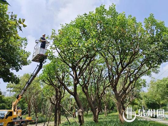 工作人员修剪刺桐树