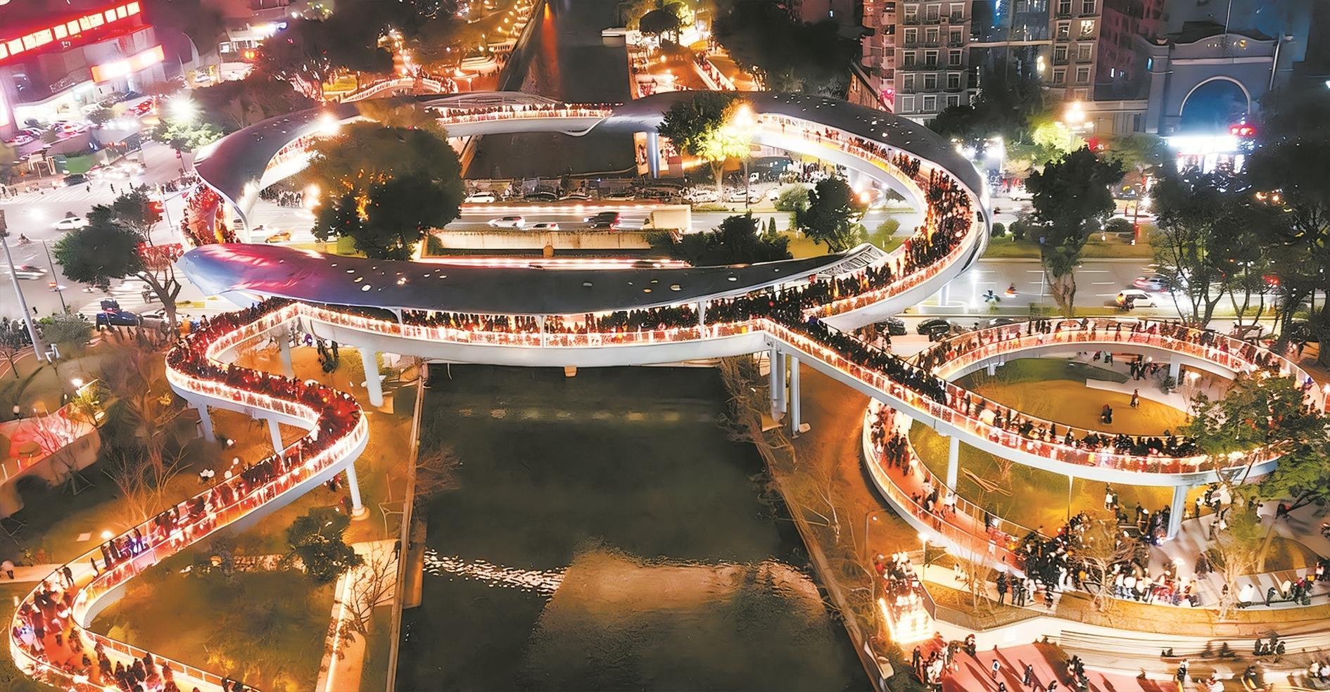 元宵夜,300多名惠安女提灯巡游,与新建成的环形天桥上演一场现代建筑与传统风情的浪漫邂逅。 (陈峻峰 摄) 全域联动多点开花 沉浸式体验成“流量密码” 惠安的年味,不止于古城。这个春节,从乡村田园到城镇街巷,“镇镇有亮点、村村有年味”的全域节庆氛围,让这座小城处处升腾着烟火气。 聚龙小镇与泉州“阿勒泰”以“山线年味”为主线,将农耕研学、温泉康养、草地音乐会与非遗木偶戏巧妙融合。热气球缓缓升空,滑草道上欢笑不断,亲子家庭占比达六成。从泉州市区赶来的林女士带着孩子看完木偶戏,眼里闪着光:“小时候只有逢年过节才能看到的布袋戏,现在家门口就能欣赏,孩子们也着迷,这样的传承真好。” 啵啵农场里,田园小火车载着孩子们穿过冬日的田野,裹窑鸡的香气混着柴火味飘散。来自厦门的李女士挽起袖子和孩子一起体验:“孩子在城市长大,很少有机会这样玩,既学了知识,又动了手,这趟来得值。”春节假期,啵啵农场日均接待超2000人次,套票售出千余张,二次消费提升35%,乡村文旅的活力在泥土与笑声中拔节生长。 惠安东湖公园则把春节过成了一场寻梦之旅。“寻找守护东湖的传奇骐骥”主线贯穿始终,高桩舞狮凌空腾跃,惠女舞龙身姿翩然,霍童线狮、英歌舞、饶平布马舞轮番登场。游客不再是围观者,而是手握解谜地图的“故事主角”,在NPC互动中穿行于传说与现实之间。星空乐园、美食嘉年华、文创市集依次铺展,“吃住行游购娱”全链条消费场景让游人尽兴而归。 各镇活动同样各美其美:螺城镇的“全民大舞台”百姓演、百姓看,夜幕下尽是欢声笑语;螺阳镇第七届“蒸肉丸”美食文化节,老手艺蒸出邻里乡情;涂寨镇的烤地瓜嘉年华,篝火旁围坐的身影映红了脸庞;小岞镇南音悠悠,唱不尽新春雅韵;雕艺文创园“石来运转”妙会,生肖文创添几分巧思;非遗舞台剧《飞马传》在聚龙小镇首演,紫山镇书法家走村入户,将春联与祝福送进千家万户。 从山间到海边,从市集到田野,惠安用一场场可触可感的沉浸式体验,把年味织进每一寸土地。