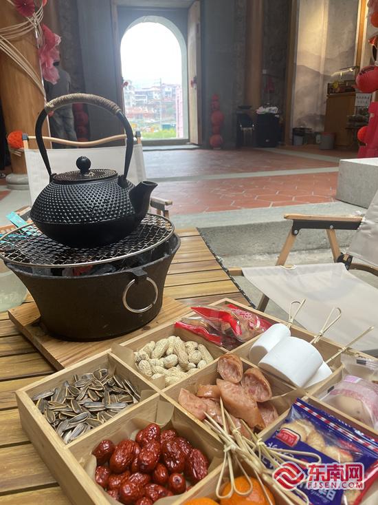 土楼油菜花田围炉煮茶。东南网见习记者 薛逸群 摄