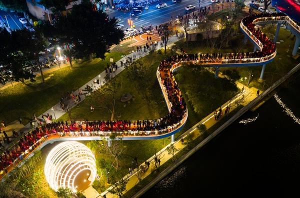 天桥赋能,贯通“滨水活力”新脉络 一、二期工程拆除体育中心105米围墙,整合体育馆4000平方米专业场地与公园绿地免费向市民开放,通过龙廊文化客厅、林下健身坊等节点,将建筑群自然融入景观。环形天桥全长276.86米,以“海浪·飘带”为设计灵感,设有四座形态各异的引桥,将原本分散的园区连为整体,彻底解决世纪大道与林辋溪对步行系统的分割问题。通过“公园、天桥、大道景观”三维联动,推动“馆园一体”的无界融合。