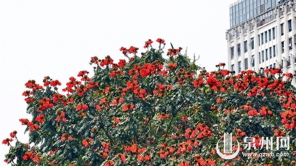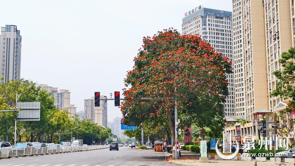 晋江长兴路的火焰木进入盛花期,远远望去宛如点燃的火炬,成为街头亮丽的季节性景观。