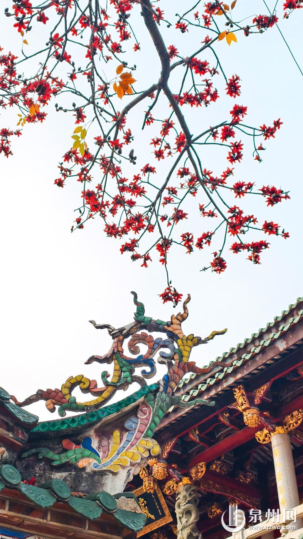 晋江安海龙山寺,木棉与燕尾脊上的剪瓷彩塑相映成画。