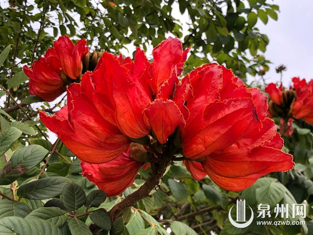 相较于刺桐花的热烈奔放,晋江长兴路的火焰木则以另一番姿态绽放光彩。眼下,长兴路宝龙社区路段的火焰木进入盛花期,伞房状的花序顶生枝头,密集的花朵簇拥在一起,远远望去宛如一把把点燃的火炬,在绿叶的映衬下益发耀眼。