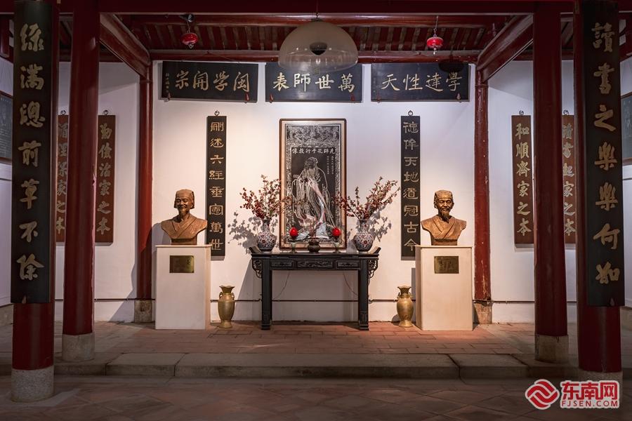 石井书院大成殿内,朱子画像高悬,两侧配祀朱松、朱在铜像。陈钧 摄