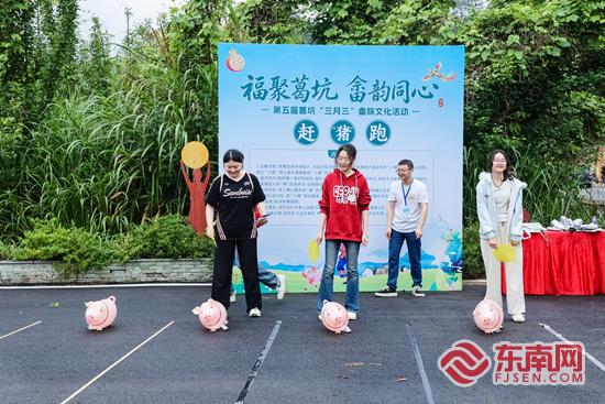 赶“猪”跑活动现场。葛坑镇 供图 东南网4月17日讯(本网记者 林婕 通讯员 江丽影)4月17日,第五届葛坑“三月三”畲族文化活动在德化县葛坑镇龙塔畲族村启幕。活动以“福聚葛坑·畲韵同心”为主题,将文明实践、村规民约、民俗传承、乡村振兴有机结合,让畲族文化在传承中焕新,让文明新风在互动中浸润,绘就民族团结、乡风文明、文旅共兴的生动画卷。 活动以畲族传统迎宾仪式拉开序幕,身着盛装的畲族同胞以拦门礼、系彩带、唱山歌等方式喜迎八方来客。现场志愿者主动引导车辆停放、维持入场秩序,将龙塔村村规民约中“新时代,讲文明”“环境优,有秩序”的要求融入服务细节。通关文牒打卡、集章兑礼等环节,志愿者引导游客有序参与、文明体验,让文明实践从村口第一站便落地生根,让畲乡礼仪与现代文明交相辉映。 |