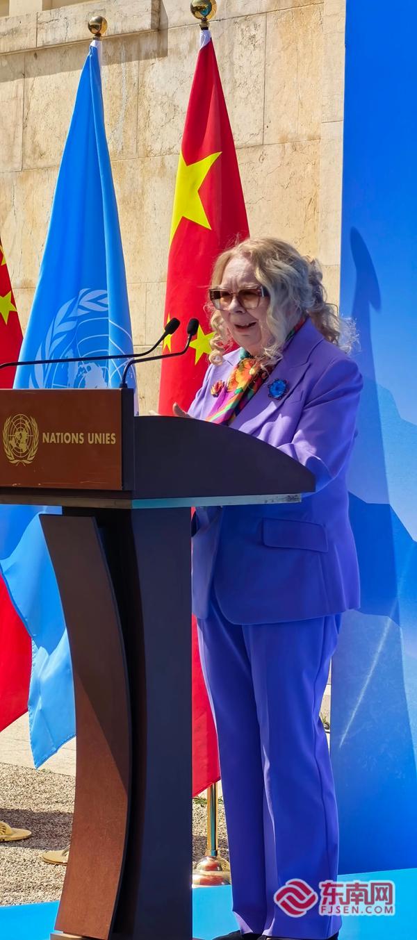联合国日内瓦办事处总干事瓦罗瓦娅女士现场致辞,胸前佩戴着刺桐花造型的金苍绣胸针。鲤城区融媒体中心 供图