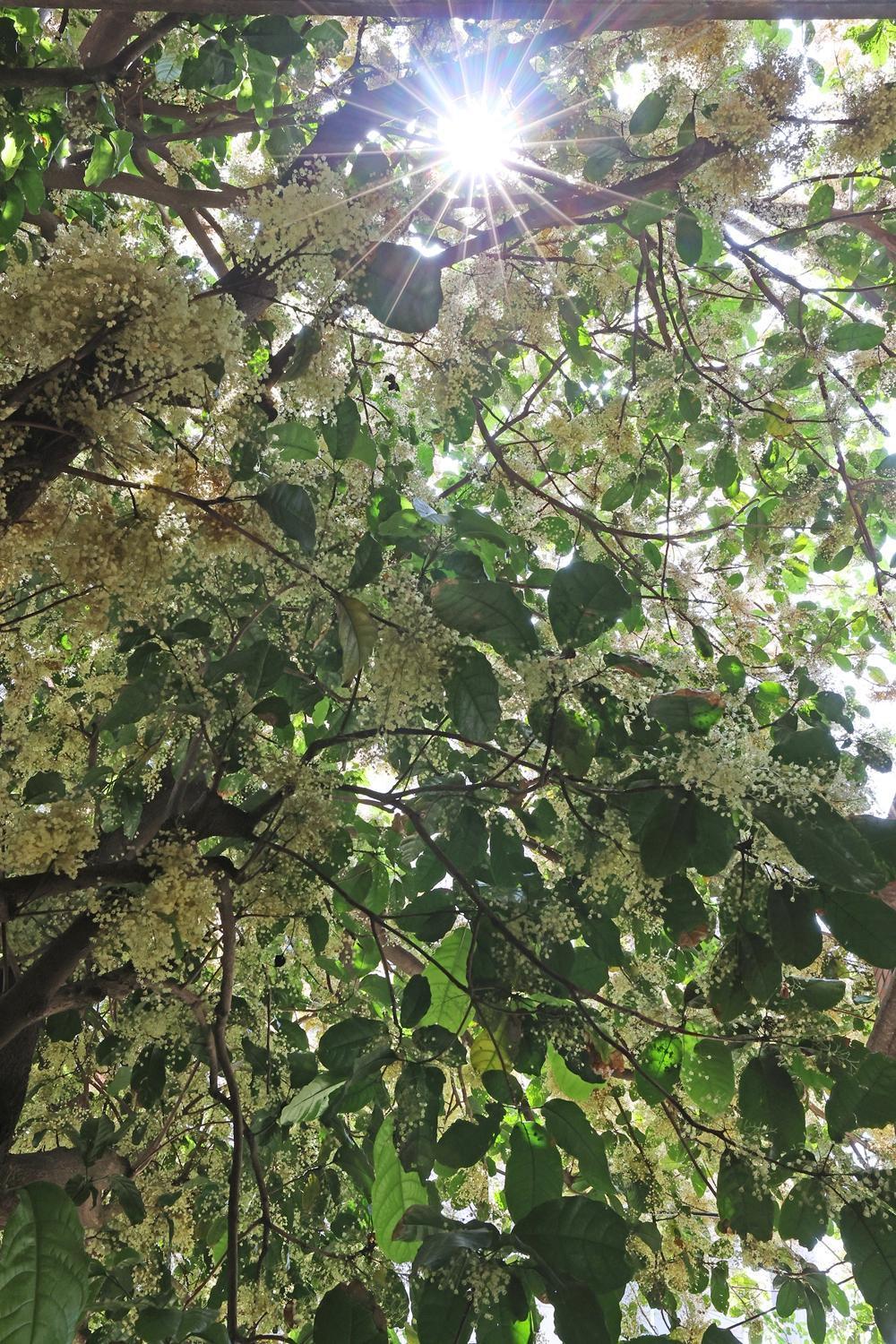 昨日上午,记者沿着九间巷走入,一株近三层楼高的大树映入眼帘。抬头望去,苹婆树的花冠硕大如巨伞,密密匝匝的白色小花缀满枝头,一团团、一簇簇,像无数繁星挤在一起,热闹又不失素雅。凑近一看,白色花朵形似倒挂灯笼,小巧而别致,微风拂过,满树繁花便簌簌而下,如春日飞雪般,铺满小巷的石桌和青石板。