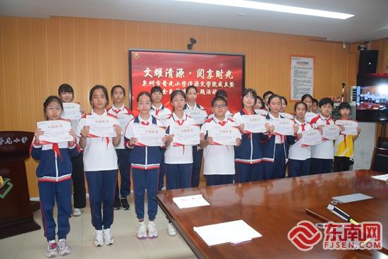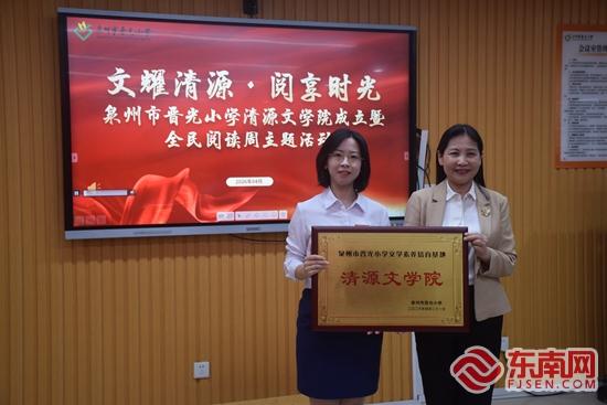 为文学院成员颁发证书。学校 供图 古为今用,清源精神润课堂 “不管是古代的书院还是现在的小学,都是为国家培养人才的地方,所以我们不仅是成立一个文学院,更是希望把先贤们在书院讲学论道的精神传承下来,让全体师生共同研习。”曾旭晴告诉记者。 作为一名青年教师,杜珠莉期待能在了解清源书院中读懂泉州崇文重教、知行合一的教育根脉。她希望能把所学所知揉进教学里,并借鉴古代书院“师友讲习、研讨笃行”的方式,把“修身勤学”的理念融入课堂和班级管理中,和学生们边说边用,边用边成长。 授牌仪式。学校 供图 值得一提的是,学校还将组织各学科组,探索将学科知识与书院文化进行跨学科融合。一方面,老师们在教学研讨中感悟先贤治学精神,以古人之风滋养今日课堂,推动教学水平不断提升;另一方面,学生们在融汇了书院底蕴的课程学习中,不仅掌握新知识,更在潜移默化中习得修身勤学之道。 从课堂到馆室,从教师到学子,清源文学院的触角正延展至校园的每一寸空间。学校将依托南俊、东海(南、北)三个校区的校史馆、未来探索馆、闽南文化馆、书画展厅等多元场馆,各展其长,立体呈现清源书院的历史风貌与文化内涵,让这方承载着清代书院遗风的校园,真正成为师生精神成长的沃土,照亮新一代师生的成长之路。