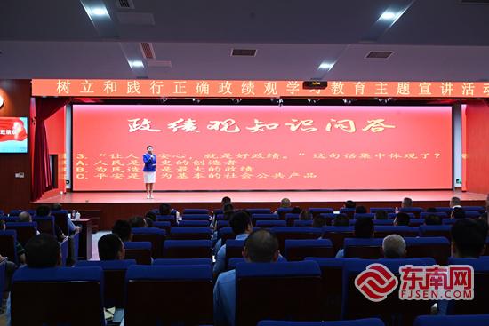 泉州出入境边防检查站执勤四队副队长洪燕森宣讲。福建省洛江监狱 供图 泉州台商投资区招商文旅集团宣讲员王娇婷带来《林俊德:一生为国铸核盾 一世甘做淡泊人》,将这位大漠铸盾、至死方休的院士形象深深印刻进听众心中,大家的眼眶中噙满泪光;惠安县惠东实验小学教师刘婷瑜以《老陈的“小事”与“大爱”》为题,讲述了老党员陈欠水“只有退休干部,没有退休党员”的赤诚坚守;南安市第一实验小学教师余小欣则以《一封山海家书里的政绩观》压轴,通过爱国华侨林谋盛的家书,展现了海外赤子跨越山海的家国担当。 宣讲间隙,活动设置了政绩观知识互动问答环节。主持人紧扣宣讲内容现场提问,台下听众踊跃抢答。“功成不必在我,功成必定有我”“把政绩树在人民群众心中”——铿锵有力的回答此起彼伏,在思辨与共鸣中深化了对正确政绩观核心要义的理解。