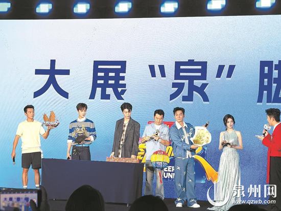 发布会上,“兄弟团”成员展示泉州非遗。 发布会上,“兄弟团”成员李晨、郑恺、沙溢、白鹿、范丞丞、李昀锐悉数亮相,《奔跑吧》制片人、总导演姚译添也来到现场分享创作幕后。宋元中国看泉州,本次发布会选择海上丝绸之路的起点城市泉州,作为全国唯一拥有联合国三大类非遗项目的城市,代表中国水密隔舱福船制造技艺的船只模型、泉州安溪竹藤编、安溪铁观音、泉州花灯、泉州木雕、永春纸织画等泉州非遗瑰宝也在发布会上亮相,通过现场直播向全世界亿万观众介绍泉州非遗。 值得一提的是,互动环节中还深度融合了泉州特有的蟳埔簪花围习俗,在现场准备了簪花头环,“兄弟团”成员为簪花头环点缀上本季全新R标,簪花造型再次成功出圈。 据了解,接下来几天,节目组将在泉州市台商区、惠安、晋江等地标景点录制,不仅展示泉州市的风土人情和城市风光,也将非遗等融入节目之中,“兄弟团”成员们沉浸式体验泉州文化和美食,把泉州的魅力进一步绽放在世界眼前。(融媒体记者 殷斯麒 文/图) |