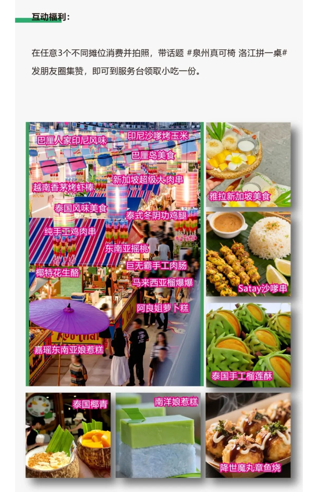 洛江区围绕“泉州真可‘椅’·洛江‘拼’一桌”主题,以南洋侨家宴为核心载体,深度融合松弛休闲的文旅理念与市井烟火生活气息,打造集美食品鉴、休闲打卡、互动体验于一体的特色文旅活动。