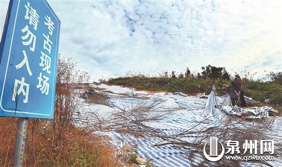 12月5日,记者来到苦寨坑原始瓷窑址。古窑址依山而建,现场已被暂时用塑料布保护起来。长期风吹日晒,布已有部分老化破裂。