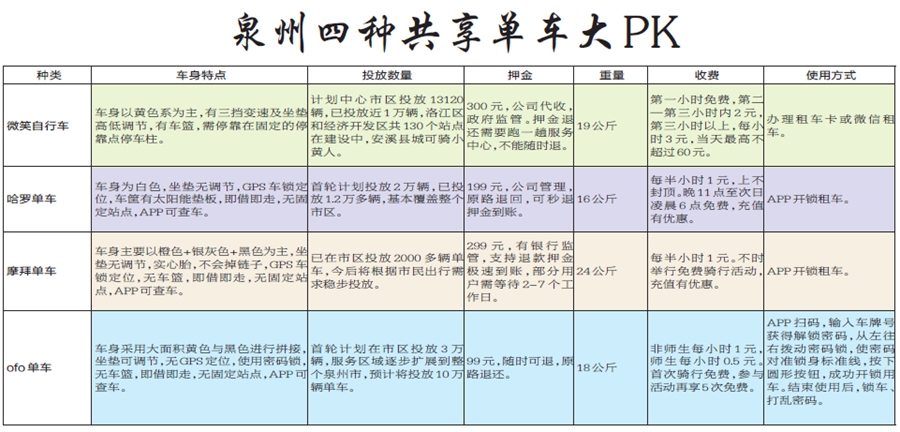 《共享单车“抢滩”中心市区》追踪 共享单车纷至沓来 市民期待规范管理 借鉴外地经验 尽快出台规定 随着ofo单车的进入,中心市区公共自行车形成“四方并进”局面,如何进行规范管理成为市民关注的焦点。 本报讯 (记者苏勇 实习生徐秋霞 文/图)昨日,又一共享单车ofo进入泉州,一夜之间中心市区多处街头出现整排黄色车身的ofo单车,与公共自行车“小黄人”、哈罗单车、摩拜单车形成“四方并进”局面。有市民认为多一种单车,多一种选择,出行更便利;也有市民担心“车满为患”,易造成违停并影响交通,希望相关部门结合泉州实际,借鉴其他城市的先进经验和做法,尽快出台相关规定,对共享单车进行规范管理。 ofo单车登陆中心市区 昨日上午,记者在中心市区泉秀街等地都见到了崭新的ofo单车,有市民好奇围观试车。由于ofo单车没有实时定位功能,市民欲用车得先在路边找到ofo单车,再手机登陆app,输入车牌号获取密码后,打开单车的密码锁方能用车。 在一排ofo单车旁,市民陈先生扫码开锁骑走一辆白色的哈罗单车,车前篮筐装着一袋东西。陈先生说他觉得ofo单车的用车开锁方式比较麻烦,而且没有车篮,市民带东西骑行不方便。 记者整理了目前泉州四种共享单车的使用明细,欢迎市民参考对比,选择合适自己的单车骑行(详见图表)。目前市民骑行最多的是公共自行车“小黄人”,至于将来何种共享单车更能获得市民青睐,还需时间考验。 _ueditor_page_break_tag_