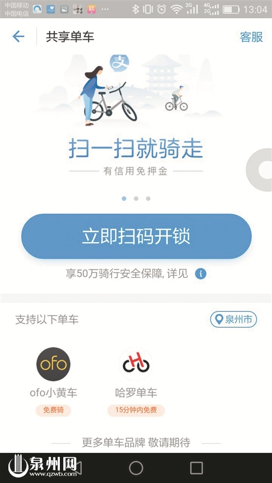 免押金骑行?泉州还没有! 支付宝在泉州可以扫码骑行哈罗和ofo单车,但必须先缴纳押金。(苏勇 摄) 核心提示 昨日,一条内容相似的微信链接刷爆了泉州市民的朋友圈。文章称,通过支付宝就可以骑6家共享单车,不需要押金,也不需要下载各家共享单车的APP了,泉州已有投放的两家共享单车哈罗单车和ofo单车也在其中。但很快有不少市民反映文章与事实不符。记者亲试发现,支付宝扫码哈罗和ofo单车仍然需要先交押金,除非已在APP注册交纳了押金才能直接开锁。哈罗和ofo两家单车的泉州公司负责人也证实,目前用支付宝在泉州扫码骑车仍需押金,至于何时能够免押金骑行,时间还未确定。 □记者 苏勇 刘倩 网文火爆 支付宝扫码解锁不用押金 共享单车现在已成了泉州人出行必不可少的交通工具之一,押金监管是否安全、能否快速退还一直是不少市民较为关心的问题,如果能实现免押金,自然免除了许多市民的担忧。 据介绍,支付宝近日宣布,从4月29日起,ofo、永安行、小蓝、Hellobike、funbike、优拜等6家共享单车品牌与蚂蚁金服达成合作,用户使用上述6家共享单车,无需单独下载各家共享单车的App,直接通过支付宝首页的扫一扫,就可以解锁上述这些品牌的共享单车。据了解,这次接入支付宝扫一扫的共享单车总计有600万辆,覆盖全国50个城市。其中,目前已投入泉州市场的共享单车中,ofo、Hellobike两家均在合作之列。 这对习惯出门骑行的市民来说无疑是个好消息,尤其是一些公众号链接的消息再三强调:不需要押金,直接扫码骑走共享单车。但真是这样吗? _ueditor_page_break_tag_