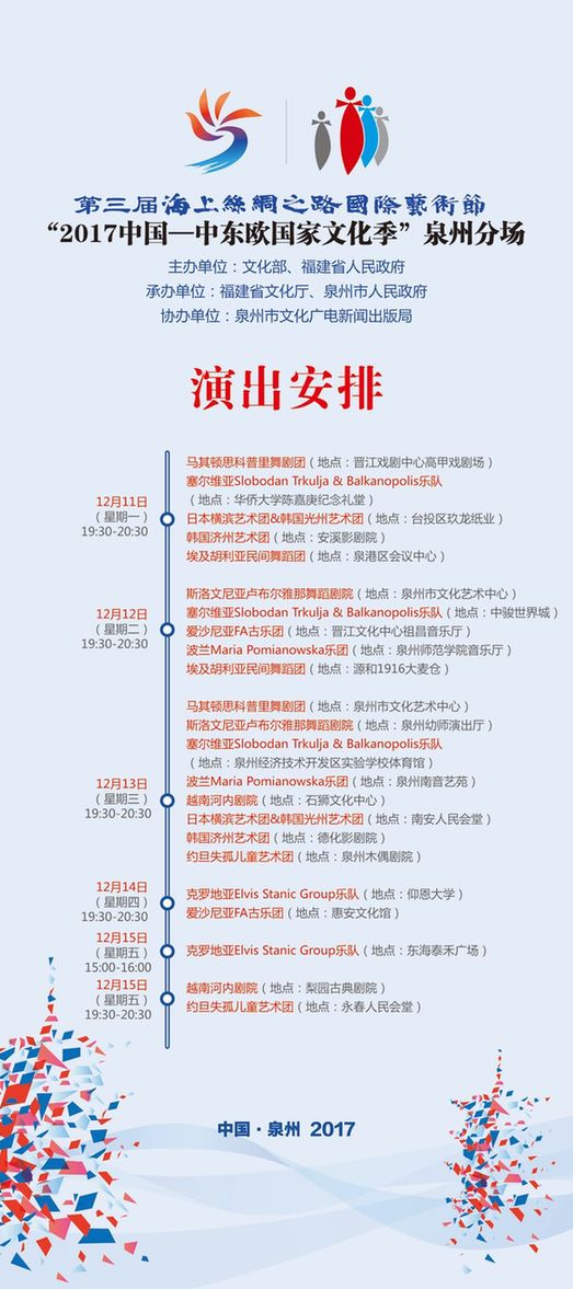本报讯(记者 颜雅婷)连日来,第三届海上丝绸之路国际艺术节活动如火如荼,海上丝绸之路艺术发展论坛上,专家们从不同视角诠释多元文化,共享海丝艺术;海上丝绸之路非物质文化遗产展上,8国非遗项目吸引市民驻足观看……那么,今天海艺节有哪些精彩活动等待市民去发现和探寻呢?一起来看看—— 核心项目 “2017中国—中东欧国家文化季”泉州分场活动