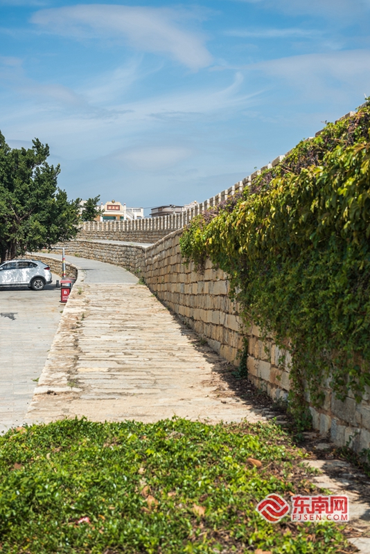 700多年历史的东山卫城古城墙,为明代朝廷防御倭寇所建。康锡彬 供图 淳朴古村蕴含独特风情 东山村位于惠安东部的小岞半岛上,是泉州市陆域最东极,北瞰湄洲湾,南接泉州湾,东望台湾海峡。1.5平方公里的土地上蕴藏着6海里的绵长海岸线,风景旖旎,如同一颗被时光打磨的明珠镶嵌在半岛上,散发着耀眼的光芒。 沿着北环岛路驱车进入小岞,海风强势迎面吹来,依山而建的村宅面朝大海,推窗便是怡人海景。数百年来,居住在半岛上的男人讨海为生,女人耕田持家,淳朴的民风延续至今。 东山村内残留着一方明代海防古城墙,见证了半岛数百年的历史。古城墙修建于明朝洪武年间,至今已700多年,为朝廷防御倭寇所建。城墙位于东山村的制高点,依山而建,高约4米,原本周长400多米,如今仅遗留一方180米新旧相接的城墙。修缮过的城门仍保留着原来的古朴,在蓝天碧海映衬下,投射出时光的斑驳感。 城内的村庄宁静祥和,新厝古宅相间而立,浓浓的烟火气让人恍然不觉这里曾是重兵驻守的卫城。城内有一口数百年的古井,如今已无人取水,但井水却从未干涸。据东山村党支部书记黄锦山介绍,最早的东山村由古城墙环抱,是一个典型的卫城,分布着粮仓、兵营、古井、观音庙等。至今,城内仍保留着供奉观音的宋代莲花寺。寺庙面向大海,古朴精致,地面上的宋代莲花石刻依然清晰可见。闽南沿海特有的石头房静静矗立在城内,时而可见身穿传统服饰的惠安女挑担出入街巷,独有的惠安渔村风情自然流露。随着时代变迁,村民也陆续走出城门,在山脚下安家繁衍生息。 根据乡村规划,东山村将结合城内的文化遗迹,融自然山水、历史文化、地方民俗文化、人居文化于一体,留住乡愁,实现文旅融合。 “东山卫城是县级文物保护单位,我们正依托村落历史文化价值,按照修旧如旧的原则,整治城内人居环境,建设生态文明村。”黄锦山介绍说,他们正鼓励城内村民在房前屋后种植蔬果,发展微田园,将美化村庄环境与致富增收相结合。 _ueditor_page_break_tag_