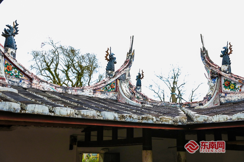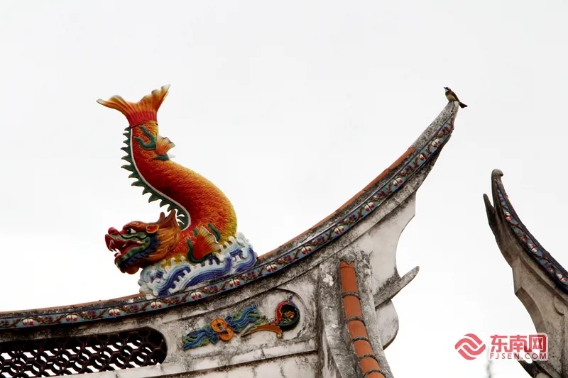 屋脊上矗立的鱼龙图案被奉为神兽,除了防止雨水侵蚀屋脊,还有辟邪消灾的寓意。东南网记者 林杰 摄 _ueditor_page_break_tag_