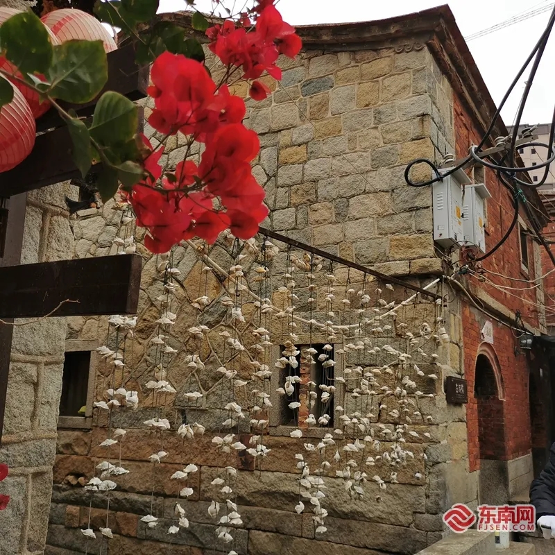 峰尾古城入口处的人造景观。东南网记者 谢玉妹 摄 古街古城 传承书香文化脉络 峰尾半岛地处湄洲湾南畔,三面临海一面环山,拥有长达13公里的海岸线,这里的人们世代以海为田,耕海牧渔。诚峰村兼具城镇的繁华与乡村的淳朴,书香文化与海洋文明并蓄。村中的峰尾古城因海防而建,至今仍可在城内看到残留的古城墙。建城六百余年来,城外沧海桑田,城内岁月静好。 漫步在古城的石板路上,时光变得悠长,浸染了风霜的古宅与开得正艳的红花相映成画,美得动人心魄;数百年的古井依然清澈见底,井水清冽甘甜;闽南红砖厝、南洋番仔楼与当地特色的石头房错落有致,各自绽放着魅力;古街两侧的书院、医馆、商铺带着浓浓的年代感,没有街区的喧嚣,更多的是古老的诗意。 诚峰村村委会主任刘雪兰就出生在古城,虽然儿时的记忆不再清晰,但对家乡的热爱却是与生俱来的。“吃了吗?”“回来了呀!”……城中还居住着不少本地村民,在一声声家长里短中,古城变得亲切了起来。村中大部分村民都姓刘,随着繁衍分支,祖庙宗祠已多达30几间,宗族文化氛围十分浓厚。此外,还有留存数百年的东岳庙、姑妈庙、永全社等多座宫庙,承载着村民代代相传的民间信仰,如今仍然香火旺盛。 _ueditor_page_break_tag_