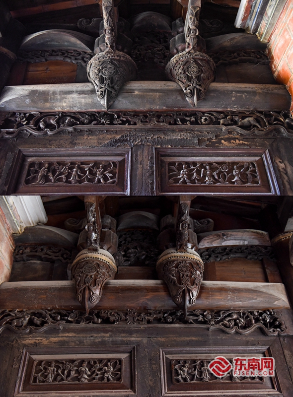 古厝中的不少雕刻按照“修旧如旧”原则进行修复。上图为旧时雕刻,下图为修复过的雕刻。东南网记者 林婕 摄 _ueditor_page_break_tag_