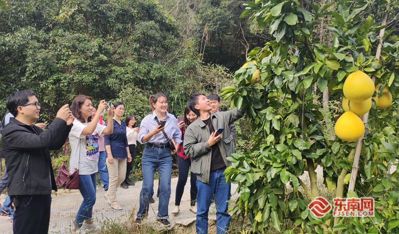 黄澄澄的黄金蜜柚吸引大家围观拍照。东南网记者 林杰 摄 东南网11月28日讯(本网记者 林杰 陈培源)11月27日,“决战脱贫攻坚、决胜全面小康”泉州市新媒体行活动走进德化县水口镇。 合作社示范带动 村民发展蜜柚事业 当天上午,采风组一行来到水口镇丘坂村黄金蜜柚种植基地,此时恰逢当地蜜柚进入成熟期,满山的果树,随处可见枝头上挂满了一颗颗沉甸甸、黄澄澄的黄金蜜柚。 “一棵树可以采40斤左右,现已进入采摘阶段,采摘时间可以持续3个月。”丘坂村村主任黄永泉说,2011年德化县岱仙种养农民专业合作社在丘坂村流转土地种植黄金蜜柚,2016年开始出产,当年产出鲜果40万斤,产值达近百万元。 据介绍,近两年来,岱仙种养农民专业合作社发挥典型示范引领作用,辐射带动周边农户包括贫困户共18户,发展种植黄金蜜柚种植面积100多亩,目前全村种植规模达250多亩。得益于当地良好的水土环境,蜜柚产量每年逐渐增加,预计今年的黄金蜜柚产量可达200多万斤。 如今,丘坂村还依托周边优良的生态环境,在柚子丰收的季节举办黄金蜜柚采摘节活动,吸引游客们走进种植基地,体验自助采摘的无限乐趣。 “通过种植黄金蜜柚有力促进当地农民增产增收,让种植黄金蜜柚成为当地村民增收的‘新引擎’。”水口镇政府有关人员说道。 _ueditor_page_break_tag_